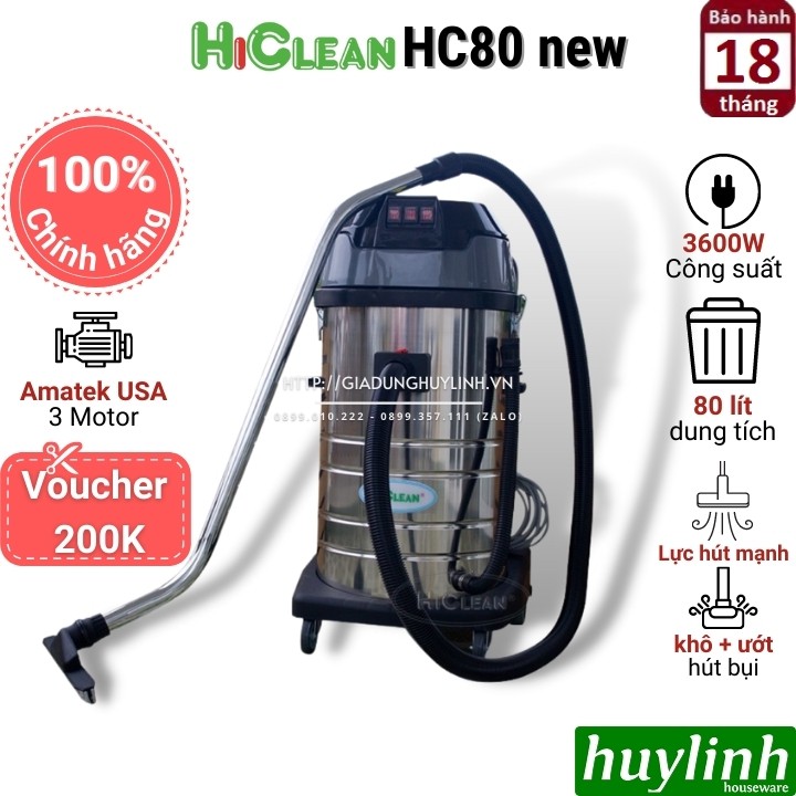 Máy hút bụi công nghiệp HiClean HC80 new 2020 được thiết kế và mẫu mã của năm 2020, với 3 motor Ametek USA, công suất 3600W dung tích 80 lít.Huy Linh phân phối và bảo hành chính hãng tại Hiclean Việt Nam.