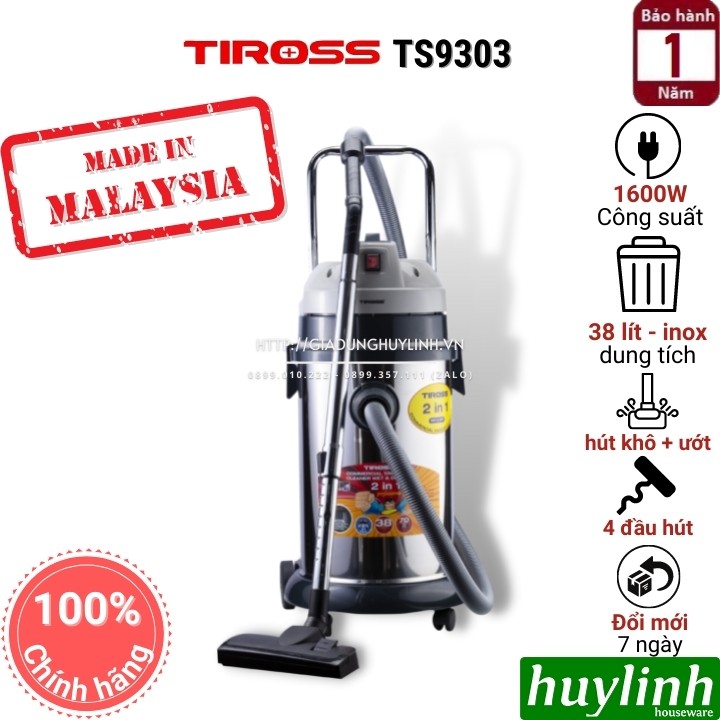 Máy hút bụi công nghiệp Tiross TS9303 với dung tích lên tới 38 lít, được sản xuất tại Malaysia phù hợp cho công xưởng, kho lớn,....[Huy Linh miễn phí vận chuyển tại nội thành HCM, vui lòng liên hệ nhân viên bán hàng]