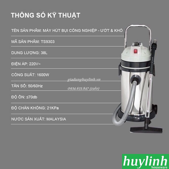 Thông số kỹ thuật Máy hút bụi công nghiệp Tiross TS9303 - 38 lít