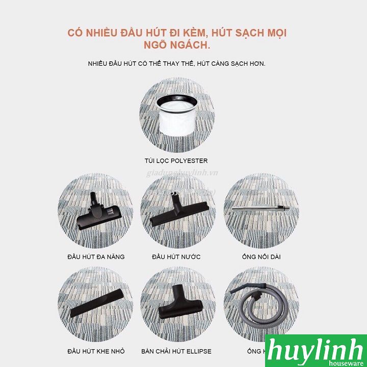 - Máy hút bụi công nghiệp Tiross TS9303 với bộ phụ kiện: túi lọc polyester, bàn hút đa năng, bàn hút nước, đầu hút khe nhỏ, đầu hút ellipse, ống hút, và ống nối dài.