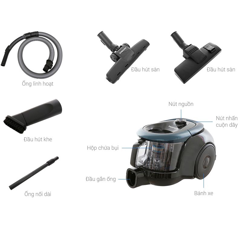 - Máy hút bụi có thiết kế nhỏ gọn và kiểu dáng sang trọng với sắc xanh xám bắt mắt cho không gian sử dụng trở nên hiện đại hơn. Trọng lượng của máy hút bụi Samsung chính hãng khá nhẹ và được trang bị bánh xe di chuyển linh hoạt hỗ trợ người dùng tối ưu nhất.