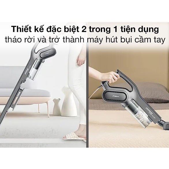 - Thiết kế 2 trong 1 có thể tháo rời sử dụng như máy hút bụi cầm tay, phù hợp với căn hộ, khu chung cư hay hộ gia đình,...