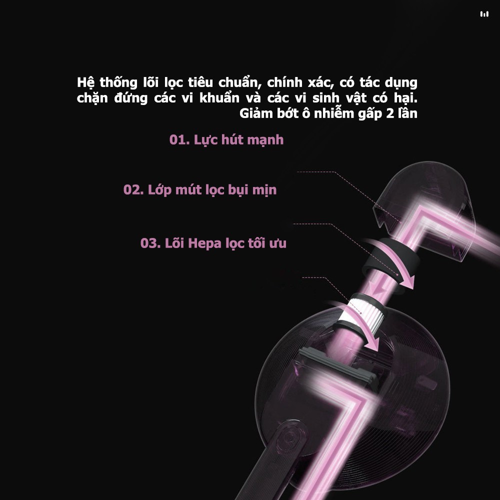 - Bộ lọc không khí 5 lớp đạt tiêu chuẩn HEPA giúp cho máy có thể thu gom đc bụi với kích