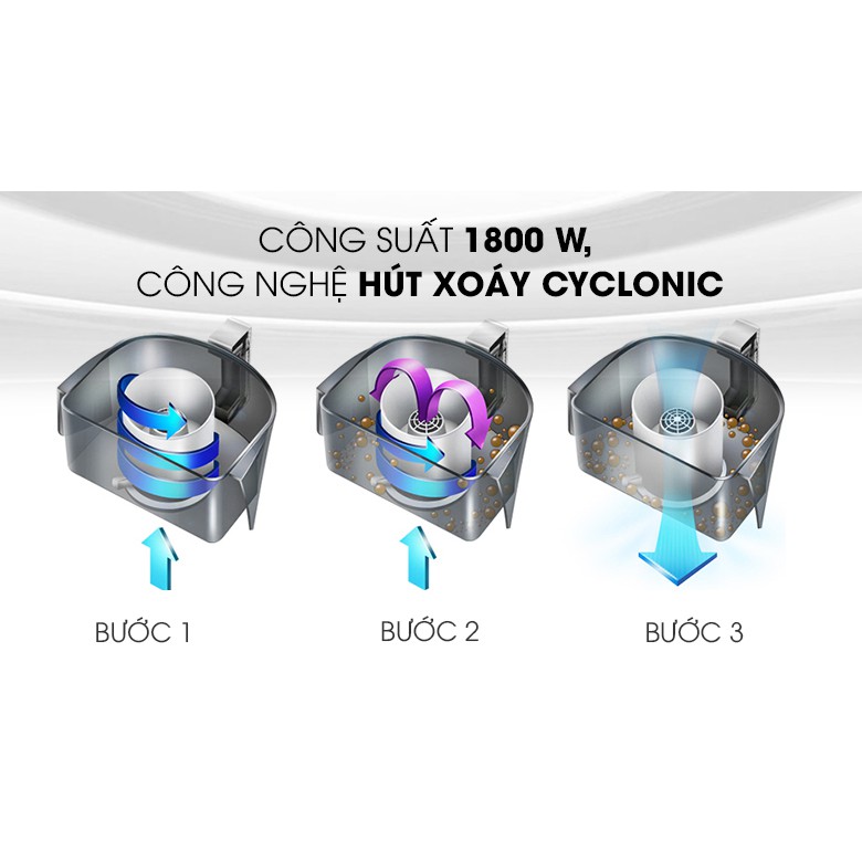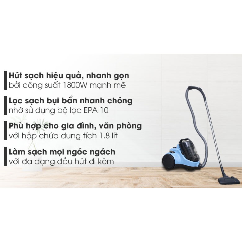 Máy hút bụi làm sạch bụi nhanh chóng với công suất 1800W, công nghệ hút xoáy Cyclonic.