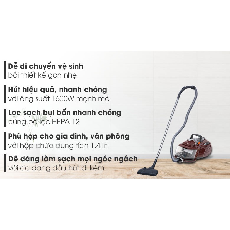 Công suất 1600 W, công nghệ hút xoáy Cyclonic xử lý và nén bụi hiệu quả.