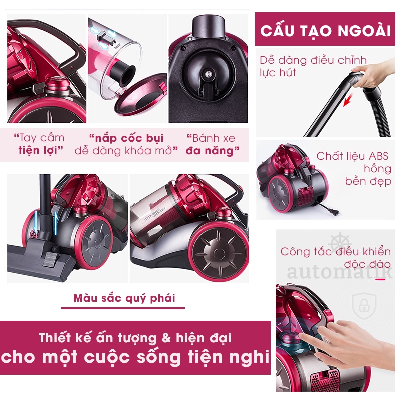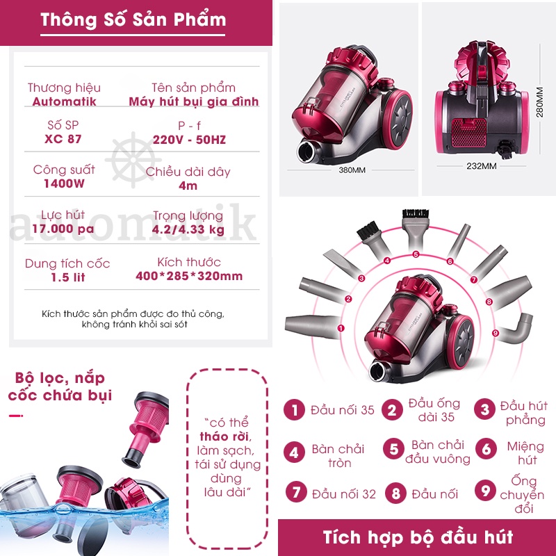 Máy Hút Bụi Gia Đình Công Nghiệp Đa Năng Lực Hút Khỏe, Ô Tô, Sofa, Sàn Nhà Cửa M11 + Tặng Bộ 09 Đầu Hút - Automatik