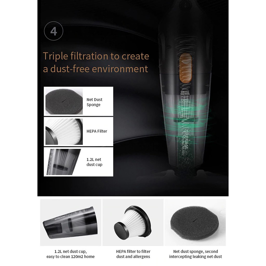 Hệ thống lọc:Hệ thống lọc bụi 3 lớp, thanh đẩy và thiết bị cầm tay, giúp quét sạch một thế giới sạch. Lọc ba để tạo