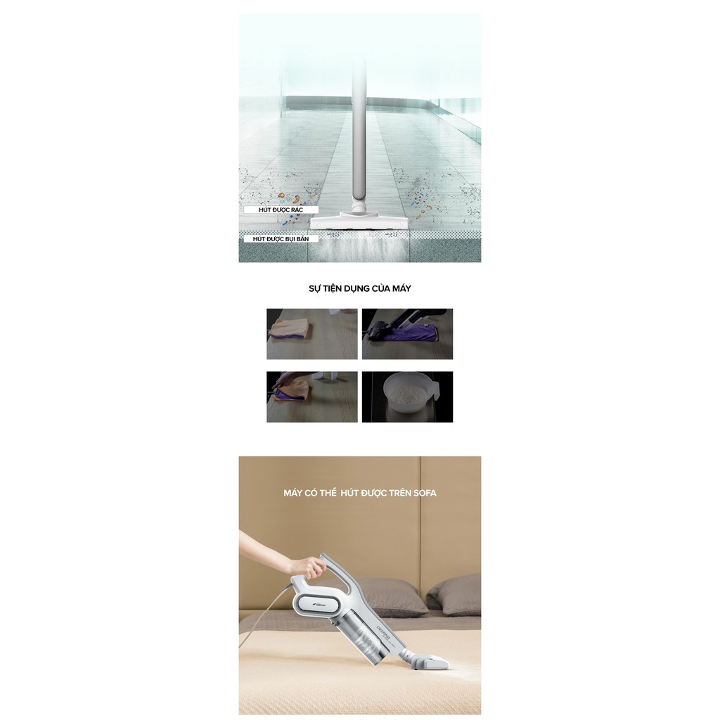 Ba đầu hút đi kèm giúp hút được ở nhiều vị trí hơn: sàn nhà, salon, bàn ghế, thảm, góc tường, các khe nhỏ, gầm tủ, cầu giúp ngôi nhà luôn sạch sẽ, thoáng đãng. Dây nguồn dài 5m, vô cùng thuận tiện để vệ sinh nhà cửa. Ngoài ra, sản phẩm được trang bị cán và tay cầm được thiết kế 2 trong 1 có thể tháo rời và nhiều đầu hút khác nhau, rất thuận tiện cho bạn khi sử dụng.