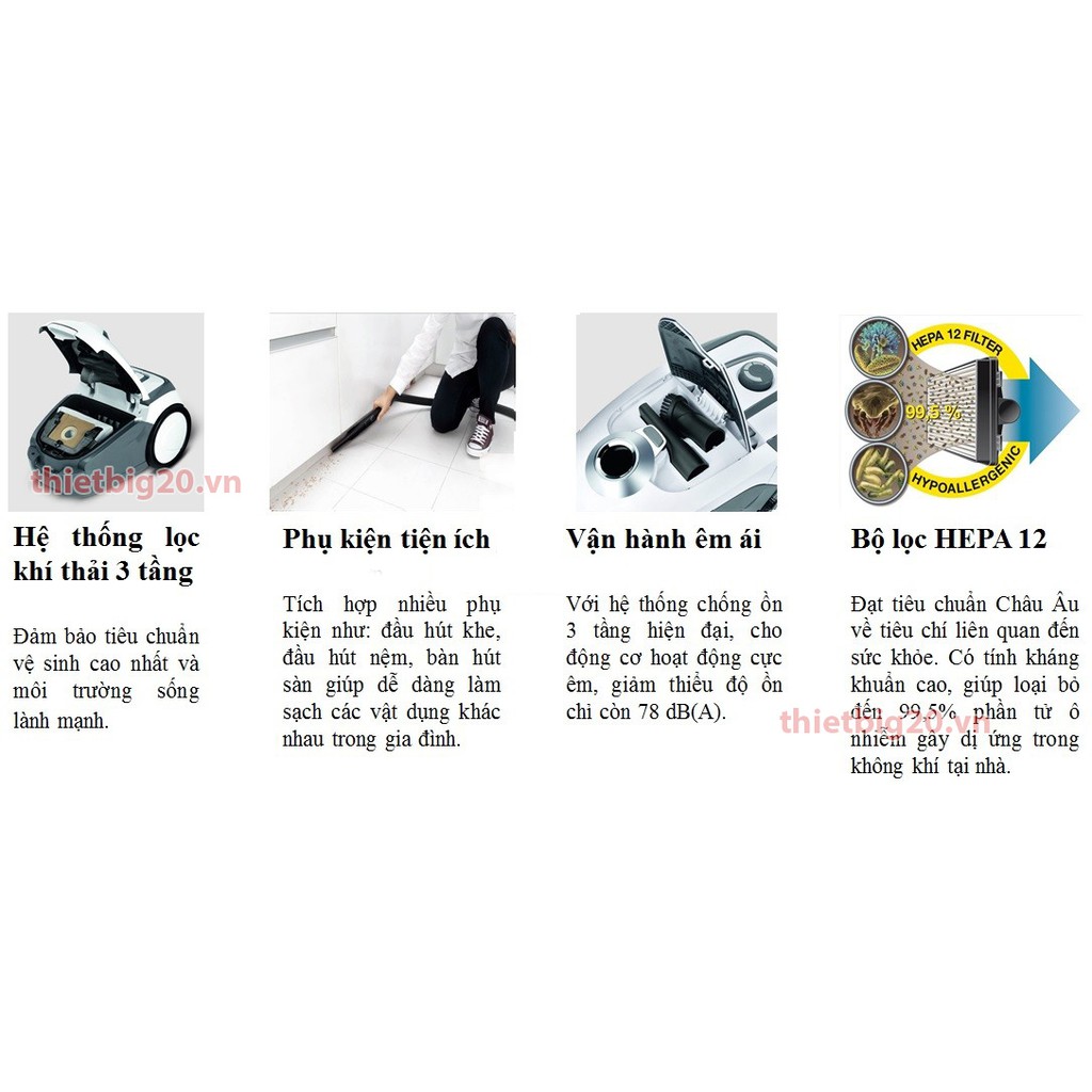 Máy được thiết kế kiểu dáng đẹp và kích thước gọn nhẹ. Phụ kiện bố trí ngay trên thân máy giúp tránh thất lạc và công việc làm sạch luôn tiện lợi. Bộ lọc khí thải HEPA 12 đảm bảo không khí luôn trong sạch. Máy hút bụi VC2 không chỉ làm sạch hiệu quả sàn nhà và thảm mà còn hút bụi hiệu quả ở các góc, cạnh và các ngóc ngách.