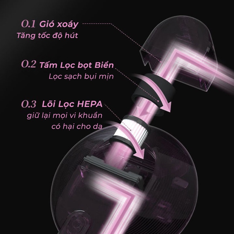 Bộ lọc HEPA với cấu trúc tháp lốc xoáy cho khả năng lọc sạch từng hạt bụi nhỏ đến 0.03 micron, các chất gây dị ứng, tránh tình trạng chảy ngược trong quá trình lọc.