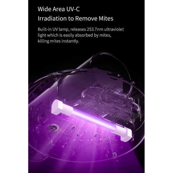 - Hút bụi khử khuẩn giường, nệm/thảm/sofa với tia UV diệt khuẩn, hút sâu và mạnh với lực hút 12kPa. Bộ rung 8000 lần/phút liên tục tác động dễ dàng hút mọi bụi mịn ẩn sâu bên dưới các lớp vải dày (Ga giường, nệm, thảm, gối...)