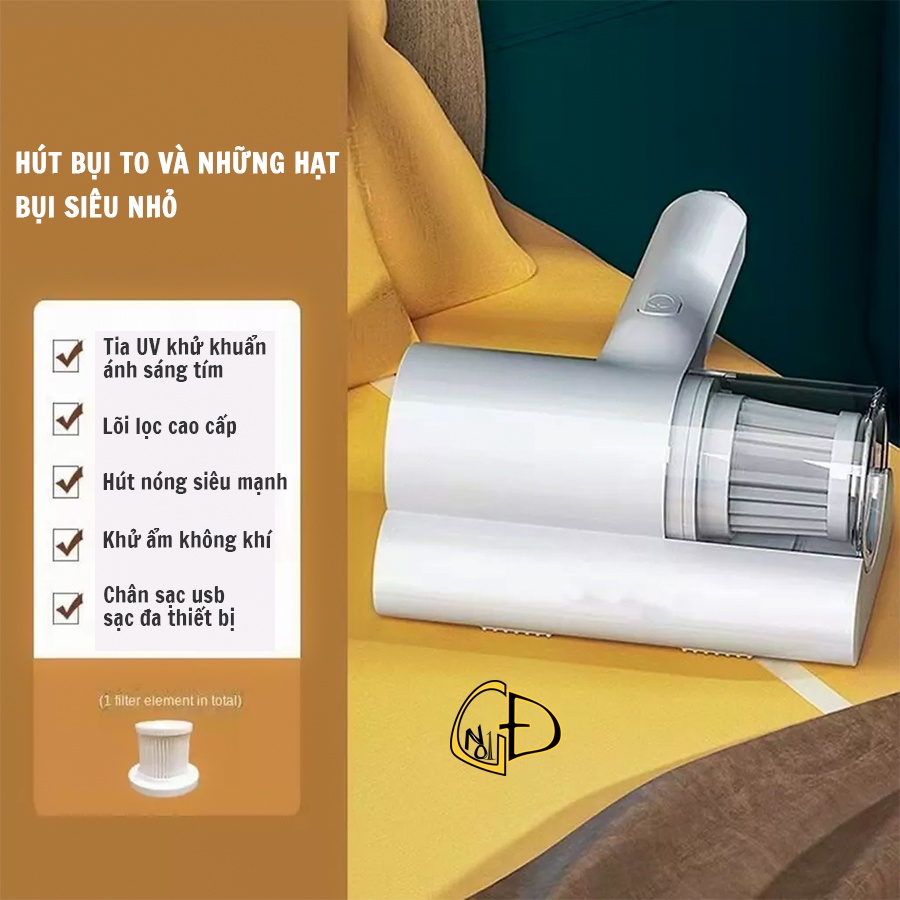 - Thiết kế máy hút bụi giường cầm tay có hệ thống quang nhiệt PTC nóng 55 độ C cùng tia UV hoạt động rung với tần số cao (8000lần/phút) nhằm ức chế các loại vi khuẩn, bọ chét bám trên từng thớ vải, làm khô nhanh chóng bề mặt, hạn chế phát sinh vi khuẩn ở một khoảng thời gian sau đó.