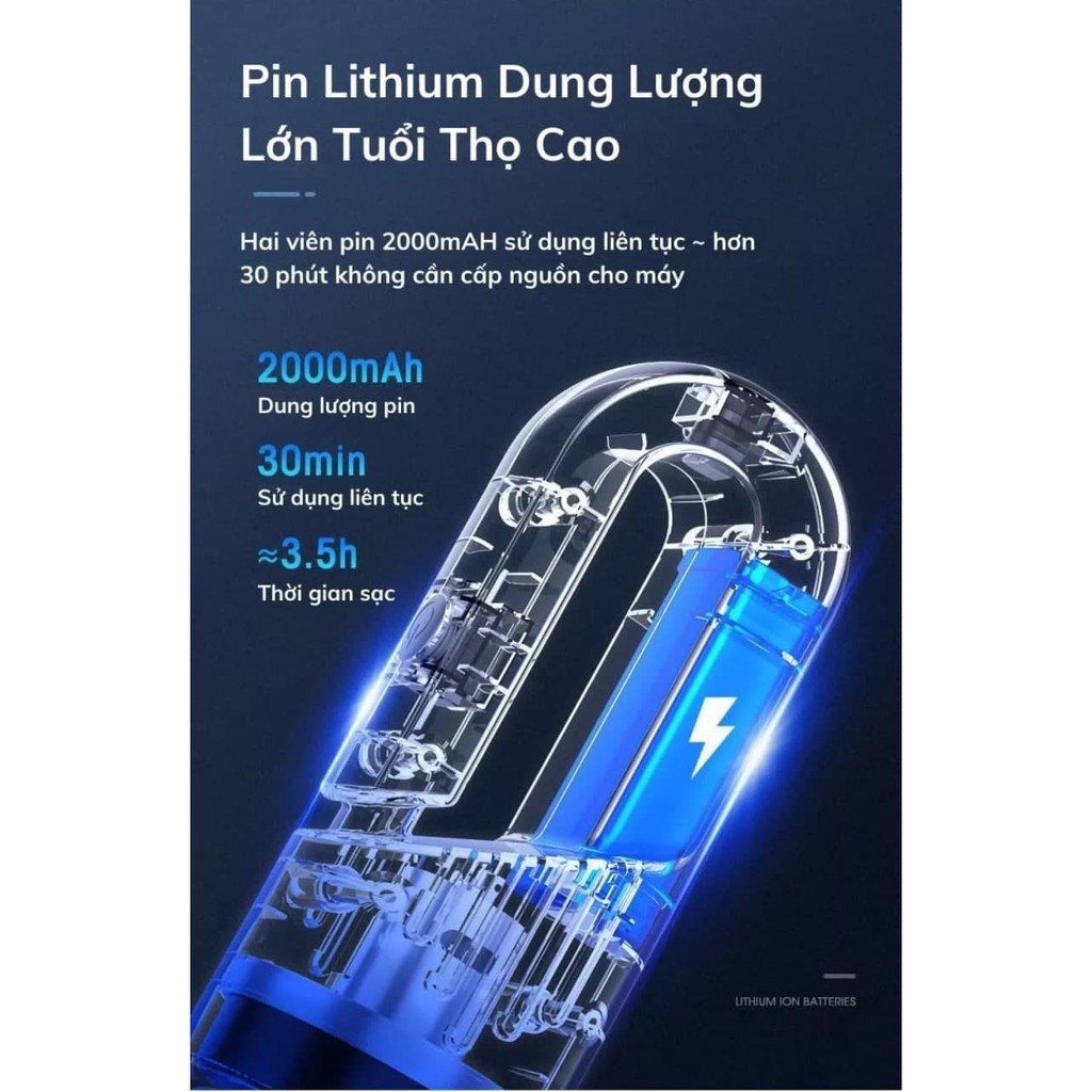 -Pin Lithium dung lượng lơn tuổi thọ cao: 2 viên pin 2000mAH sử dụng liên tục ~ hơn 30 phút không cần cấp nguồn cho máy