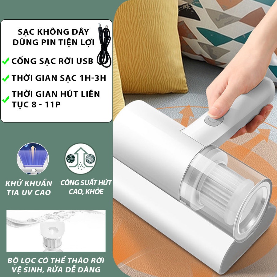 Máy hút bụi giường nệm sofa cầm tay có tia uv khử khuẩnTrên giường ngủ của bạn không hề sạch như bạn nghĩ. Cho dù bạn đã chăm chỉ giặt giũ. Sẽ có rất nhiều thứ: bụi bám trên vải ga (drap), vải bị xù lông, tóc, lông, vi khuẩn,virus và đặc biệt là bụi bẩn có thể gây ra hen xuyễn, viêm phế quản và các bệnh dị ứng qua da… Việc sở hữu một máy hút bụi giường nệm cầm tay sẽ là lựa chọn sáng suốt và hết sức cần thiết nhé. Máy hút bụi giường đệm hút bụi diệt khuẩn tia UV là lựa chọn tốt nhất “chọn mặt gửi vàng” đến cho khách hàng.