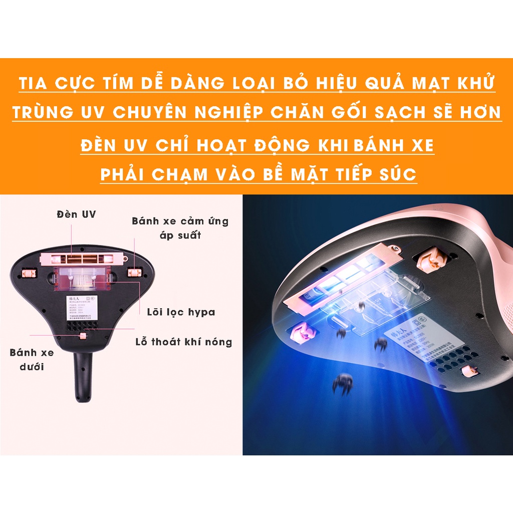 -Lực hút mạnh, bề mặt hút rộng với thiết kế hệ thống quang nhiệt PTC nóng 55 độ C cùng tia UV hoạt động rung với tần số cao (8000lần/phút) nhằm ức chế các loại vi khuẩn, bọ chét bám trên từng thớ vải, làm khô nhanh chóng bề mặt, hạn chế phát sinh vi khuẩn ở một khoảng thời gian sau đó.
