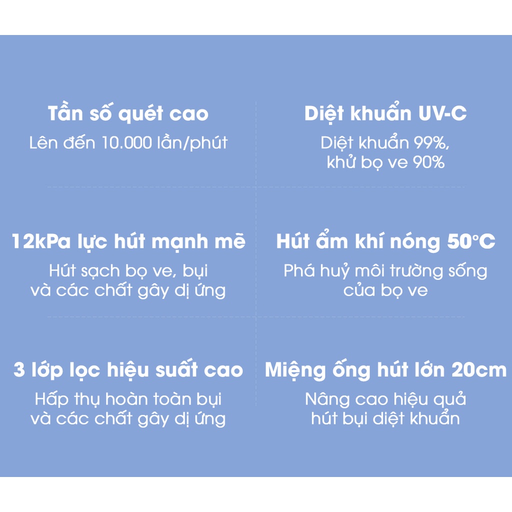 Máy hút bụi chân không được trang bị chế độ khử trùng tiên tiến với hiệu quả khử trùng lên đến 99%. Cụ thể, đèn UV với khả năng phát ra nguồn sáng ổn định 254nm, giúp giải phóng tia cực tím giai đoạn C, ức chế khả năng sinh sản và tiêu diệt hoàn toàn 90% các loại mạt, vi khuẩn, bọ ve… sống trong nhà.