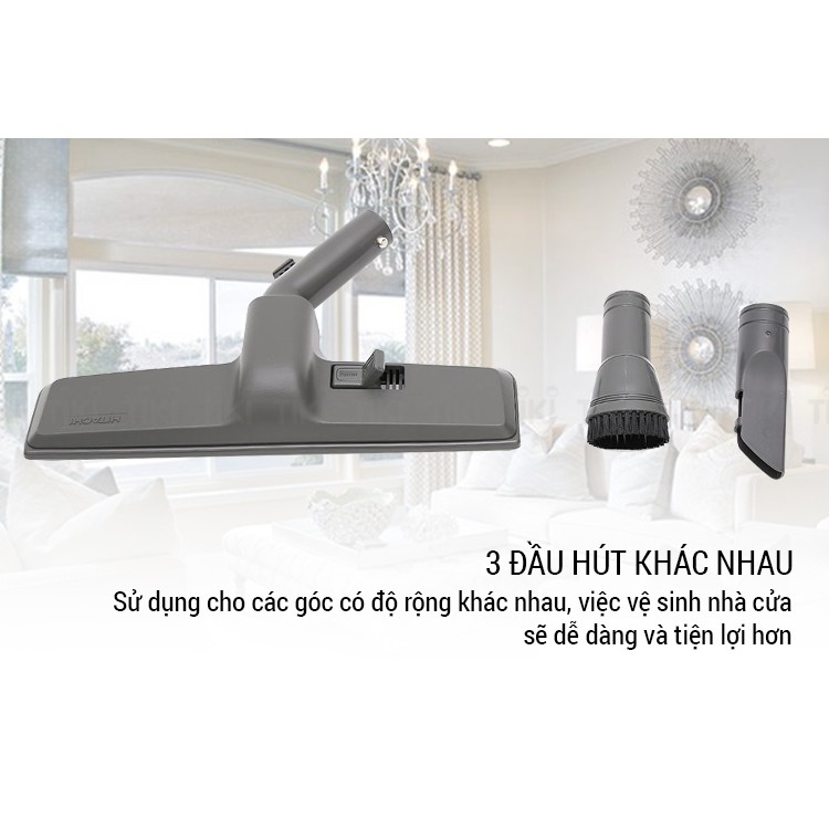 Đi kèm theo máy hút bụi là 3 đầu hút khác nhau và bàn chải, sử dụng cho các góc có độ rộng khác nhau, việc vệ sinh nhà cửa sẽ dễ dàng và tiện lợi hơn.