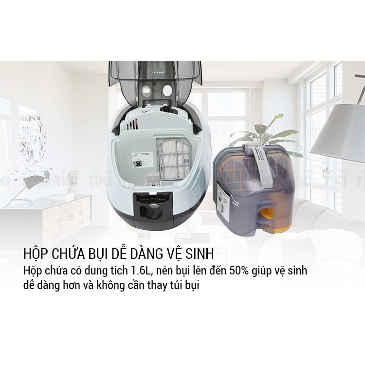 Hộp chứa bụi dễ dàng vệ sinh Hộp chứa có dung tích 1.6L, nén bụi lên đến 50% giúp vệ sinh dễ dàng hơn và không cần thay túi bụi, thêm tiện lợi và tiết kiệm thời gian hơn so với máy hút bụi sử dụng túi bụi truyền thống.