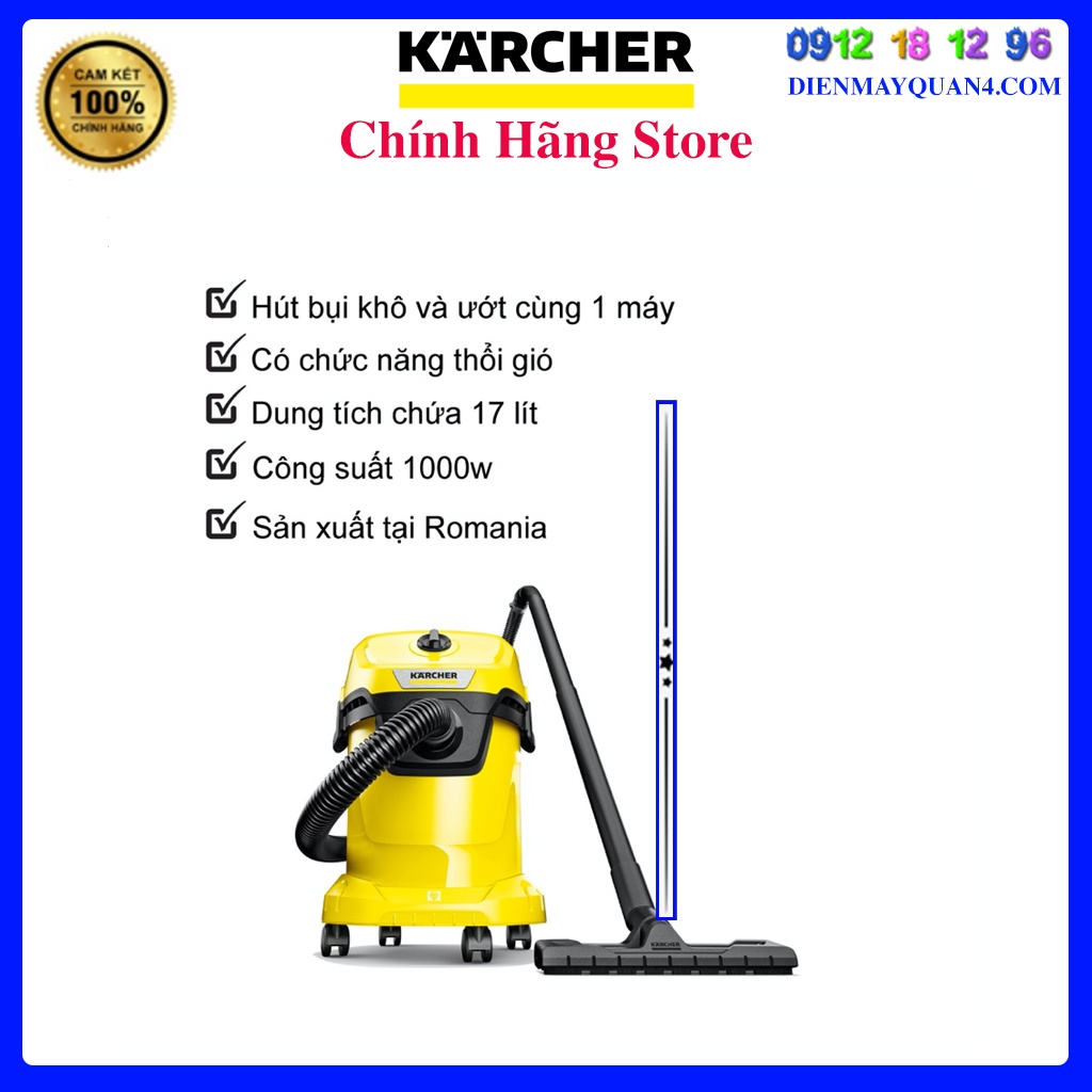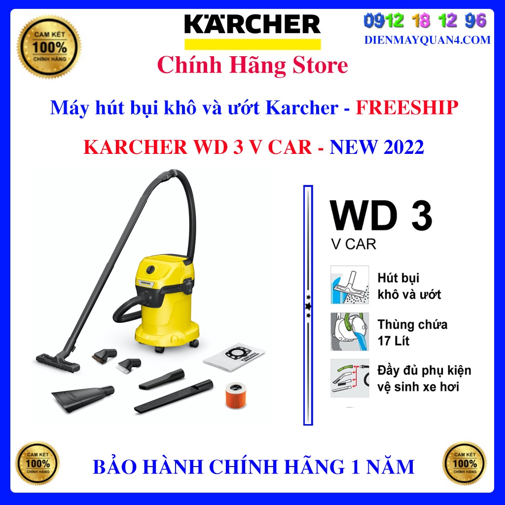 - Máy WD 3 V Car là một máy hút bụi ướt (máy hút bụi khô & ướt) mới cải tiến cho dòng máy hút bụi đa năng WD 3 car với điện năng tiêu thụ chỉ 1.000 watt. Mặc dù lượng tiêu thụ thấp, thiết bị này mạnh mẽ như một máy hút bụi 1200-watt. Máy hút bụi Karcher giúp cho việc vệ sinh nhà cửa, vệ sinh sân vườn, gara ô tô, nhà xe, xưởng nhỏ ...làm sạch hiệu quả và làm sạch toàn diện hơn.