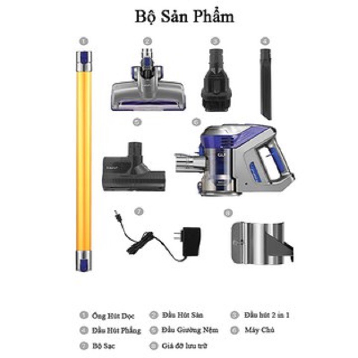 Bộ sản phẩm bao gồm : 1 ống hút nối dài ; 1 đầu hút sàn tích hợp con lăn ; 1 đầu hút 2 in 1 ; 1 đầu hút khe; 1 đầu hút giường nệm, sofa ; 1 máy chủ ; 1 bộ sạc ; 1 giá đỡ lưu trữ.