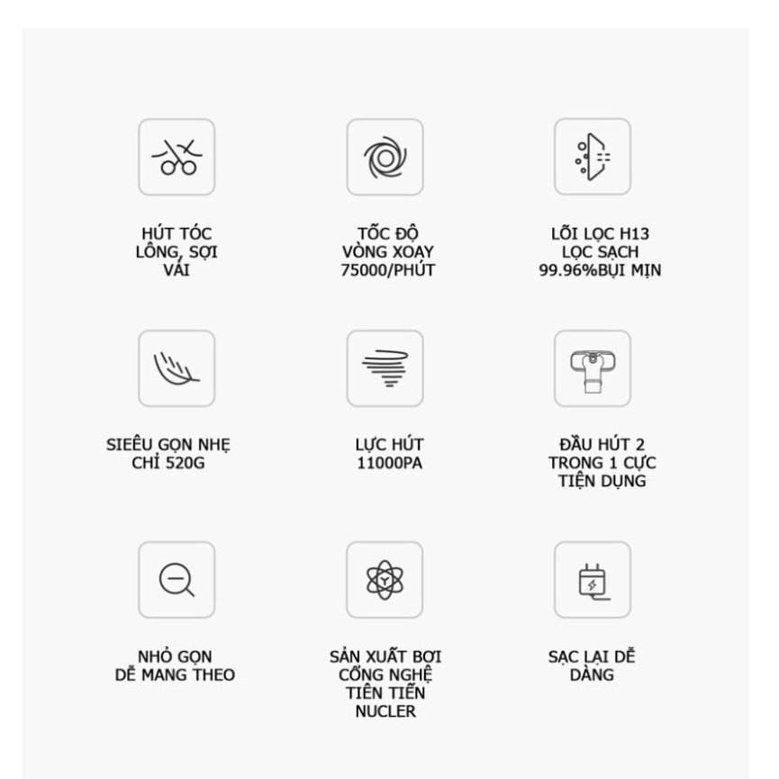 - Tuýt lọc: Cyclone Filtration + H-10 HEPA