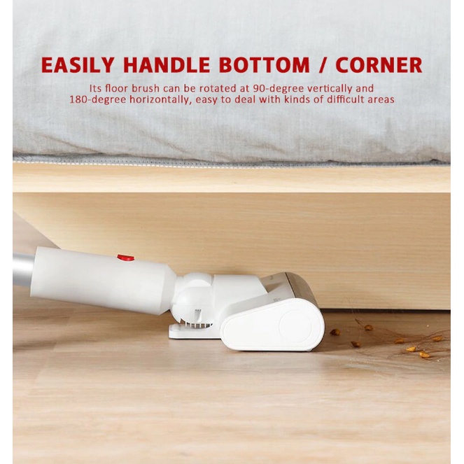- Đầu hút bụi sàn có thể xoay 90° theo chiều dọc và 180° theo chiều ngang, dễ dàng len lỏi vào khắp ngóc ngách của căn phòng. Bàn chải sàn có động cơ điện tích hợp, có thể xoay 2500 lần một phút. Với các sợi lông xoay theo đường xoắn ốc, các khe nhỏ trên sàn nhà cũng được làm sạch triệt để.