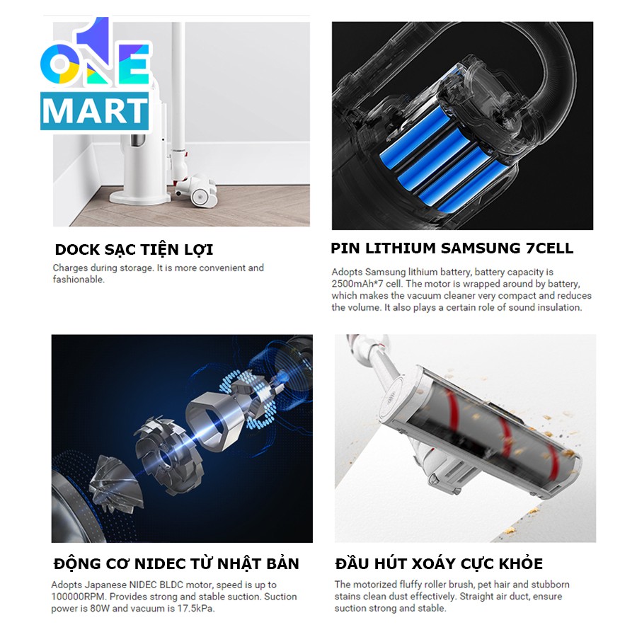 Máy sử dụng pin Lithium của Samsung, dung lượng pin là 2500mAh * 8 cell. Pin được thiết kế bao xung quanh động cơ, khiến chiếc máy hút bụi trở nên rất nhỏ gọn. Đồng thời nó cũng góp phần cách âm, giảm tiếng ồn từ động cơ rất tốt.