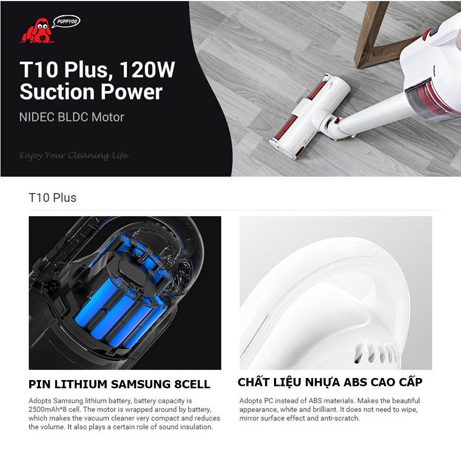 Giới thiệu Máy hút bụi không dây cao cấp Puppyoo T10 Plus động cơ NIDEC lực hút cực đỉnh 19kPa dock sạc thời trang bảo hành 24T