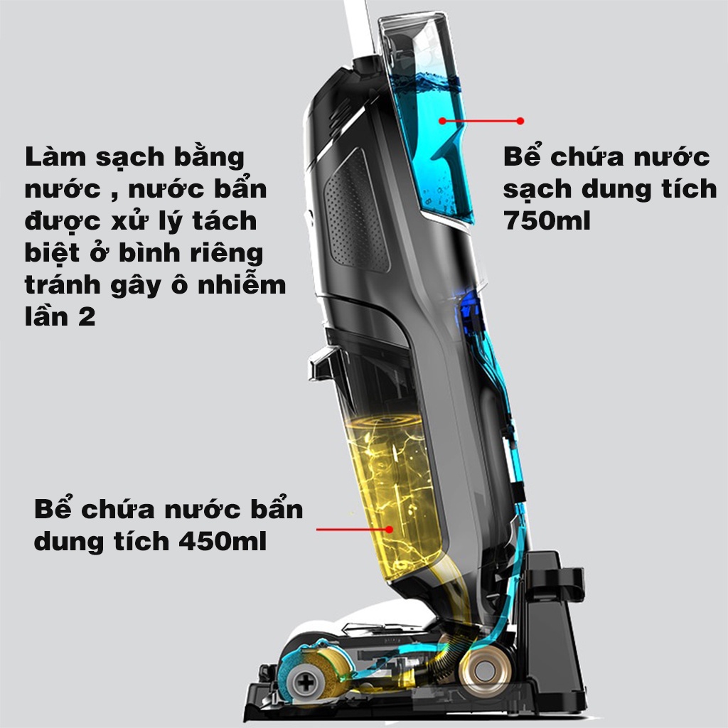 Bình chứa nước sạch có dung tích lớn 750ml, có thể vệ sinh cả nhà sau khi đổ đầy, không cần bổ sung thường xuyên