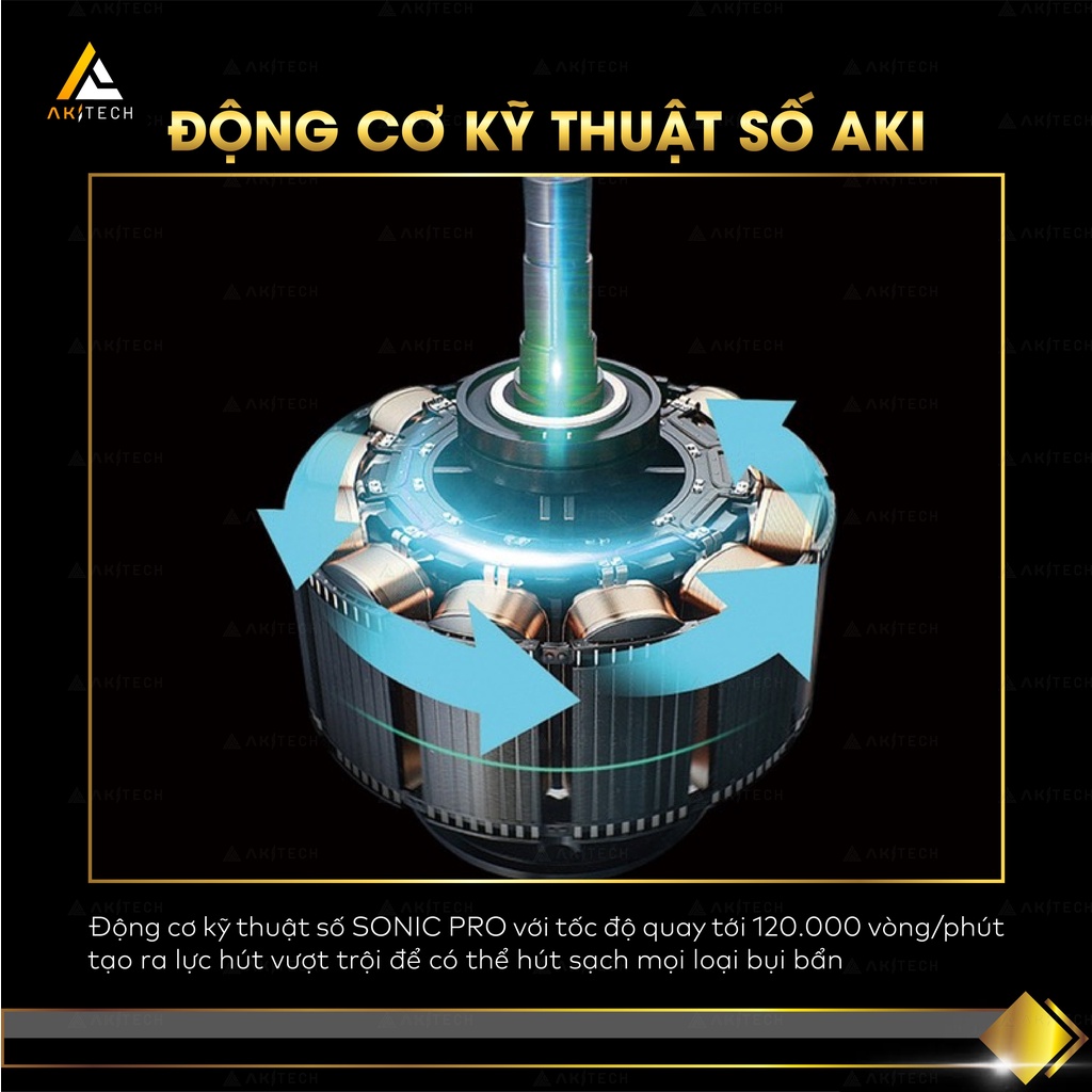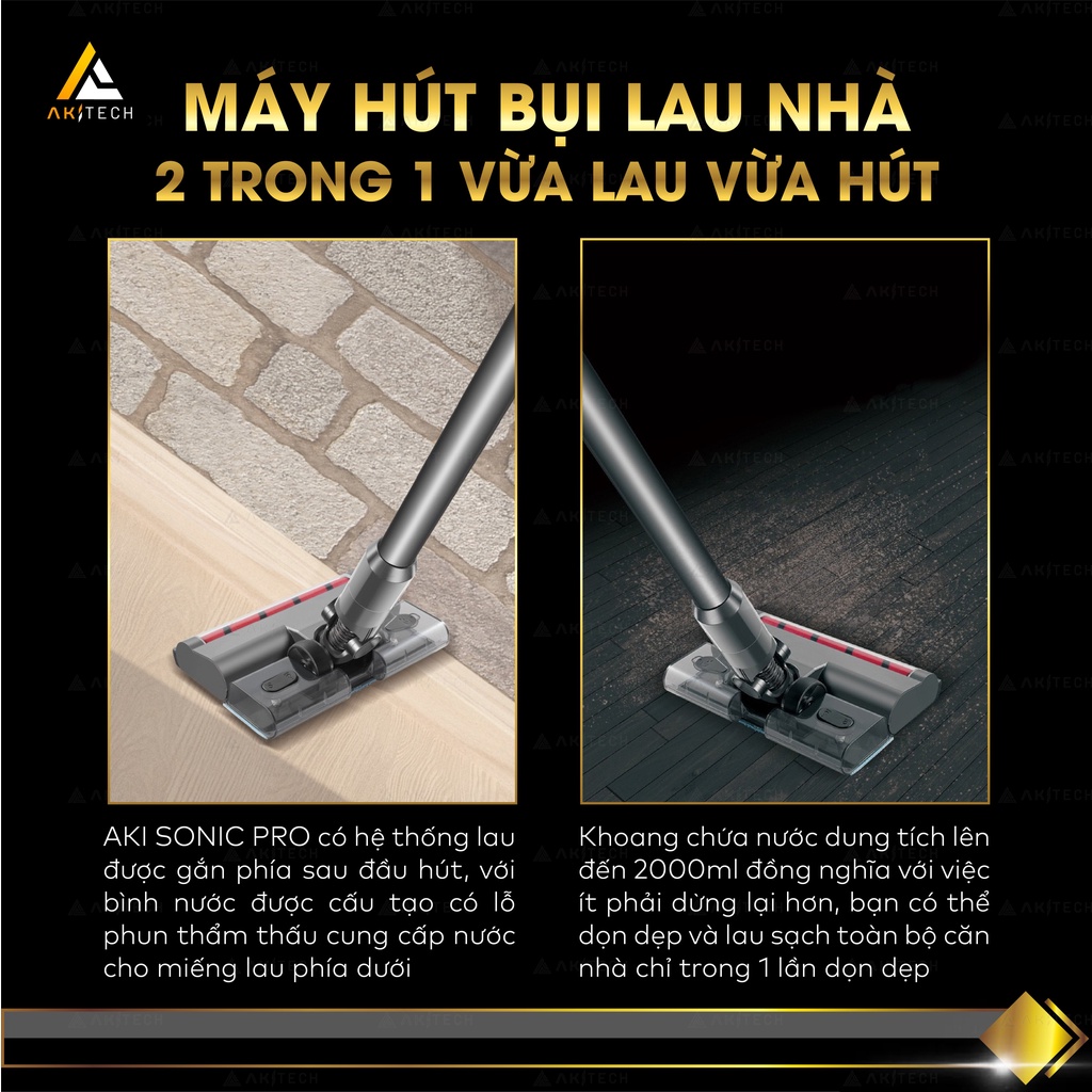 - Máy hút bụi AKI SONIC PRO nổi bật với hệ thống lau được gắn trực tiếp phía sau đầu hút, với 1 bình nước được cấu tạo với 2 lỗ phun thẩm thấu cung cấp nước cho miếng lau phía dưới