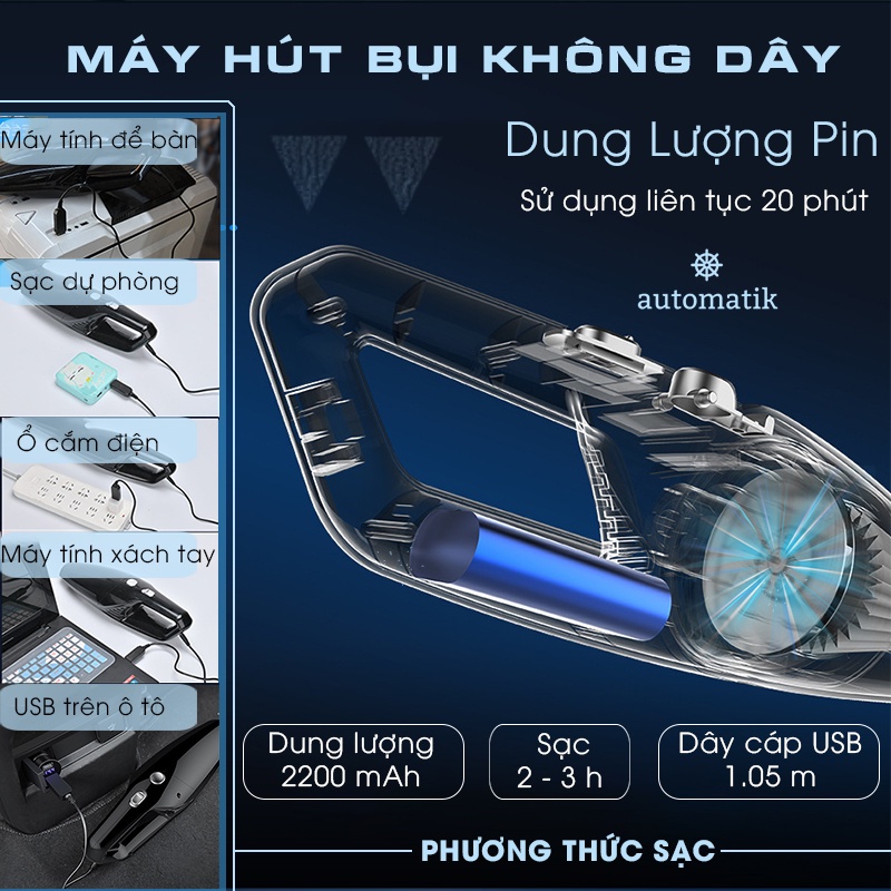 Thiết kế: không dây, sang trọng, nhỏ gọn, tay cầm thuận tiện đi kèm nhiều loại đầu hút