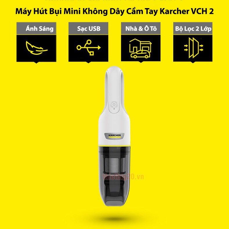 Máy hút bụi mini không dây cầm tay Karcher VCH 2 (Pin sạc)Nhỏ gọn và rất mạnh mẽ, máy hút bụi cầm tay VCH 2 chạy bằng pin rất phù hợp cho việc hút bụi hàng ngày, nhanh chóng xử lý các mảnh vụn, bụi hoặc tóc trên đồ nội thất và sàn nhà hoặc trong xe hơi,...