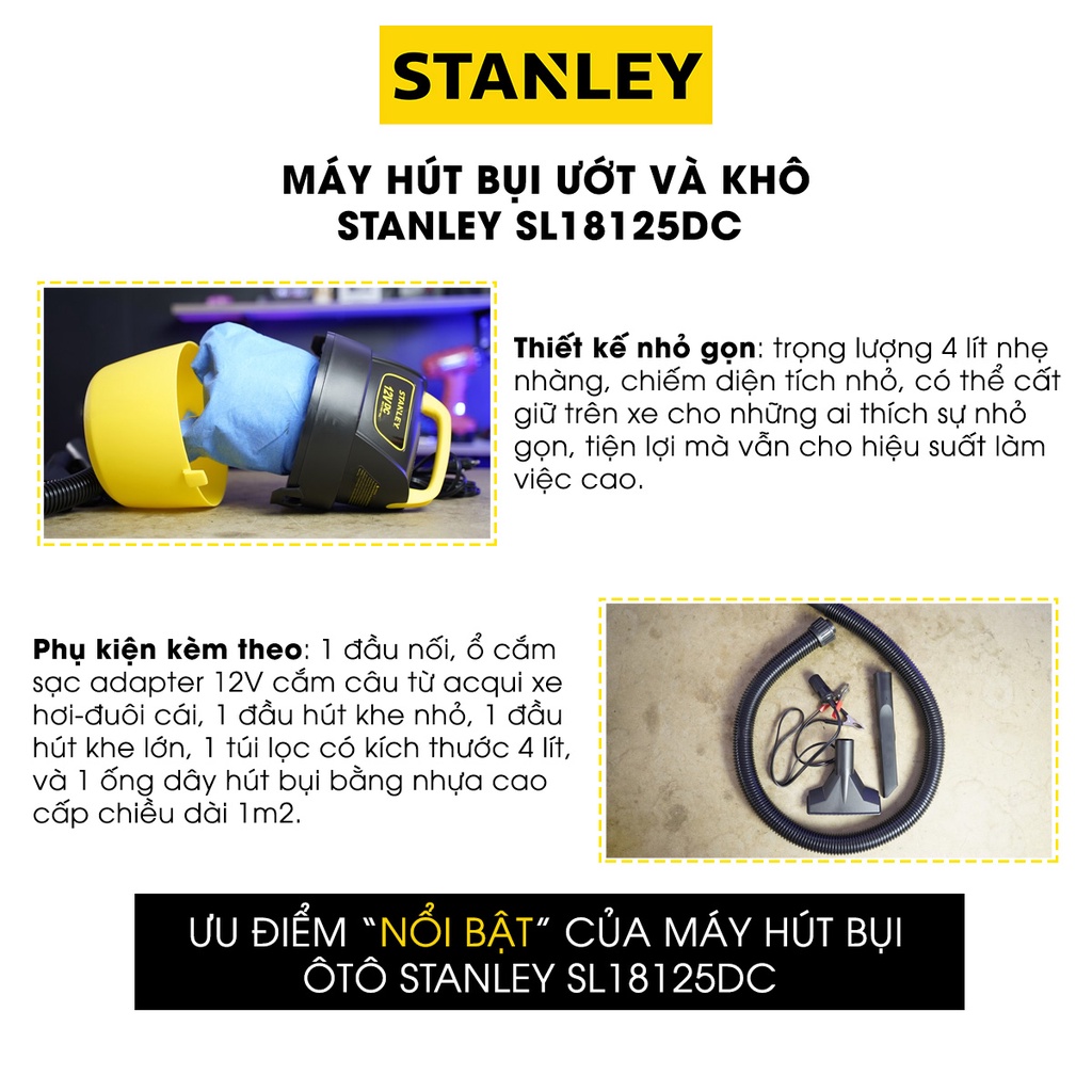 Giới thiệu Máy hút bụi ô tô 12V DC Stanley SL18125DC công suất lớn 1.5HP, dung tích 5L, kèm theo nhiều phụ kiện - chính hãng -xsafe