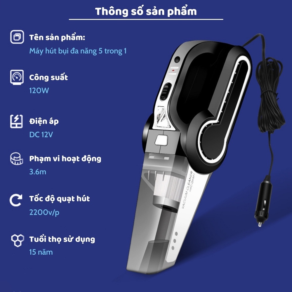 Máy hút bụi, bơm lốp xe ô tô đa năng có các thông số sau