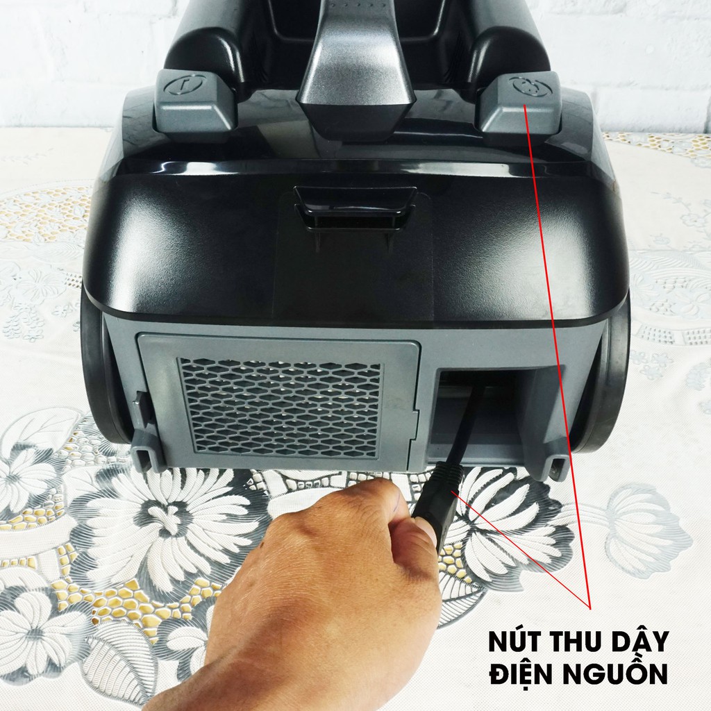 - Máy hút bụi có dây điện thu gọn vào máy nhanh bằng cách nhấn vào nút thu dây thiết kế trên thân máy