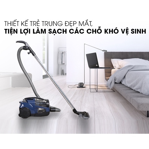 Máy hút bụi Panasoniccó màu xanh đen tinh tế, sang trọng, kích cỡ gọn nhẹ cùng thiết kế bánh xe giúp di chuyển linh hoạt, nhanh chóng