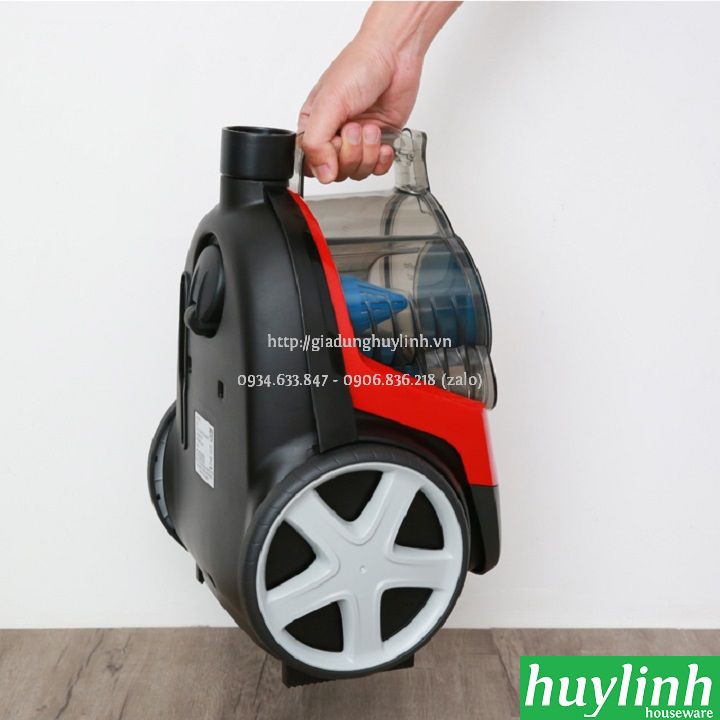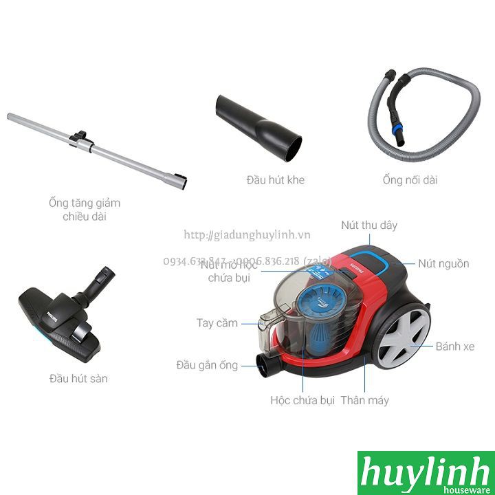 Máy hút bụi Philips FC9351 sử dụng bộ lọc khí EPA10 và công nghệ Power Cyclone 5 giúp tăng tốc không khí trong khoang lốc xoáy để phân tách bụi, loại sạch bụi ra khỏi không khí. Sản phẩm được Huy Linh phân phối chính hãng từ Philips Việt Nam.- Máy hút bụi Philips FC9351 với thân máy mang màu đỏ, kiểu dáng nhỏ gọn sẽ giúp cho không gian căn bếp nhà bạn thêm sang trọng, hiện đại. Sản phẩm mang kiểu dáng của máy hút bụi truyền thống nhưng nhỏ gọn hơn. Ống thu gọn 2 phần bằng kim loại, có thể hoạt động trong bán kính 9m. Đồng thời, được trang bị 2 bánh xe cao su lớn để thuận tiện cho việc di chuyển khắp nơi trong căn nhà.