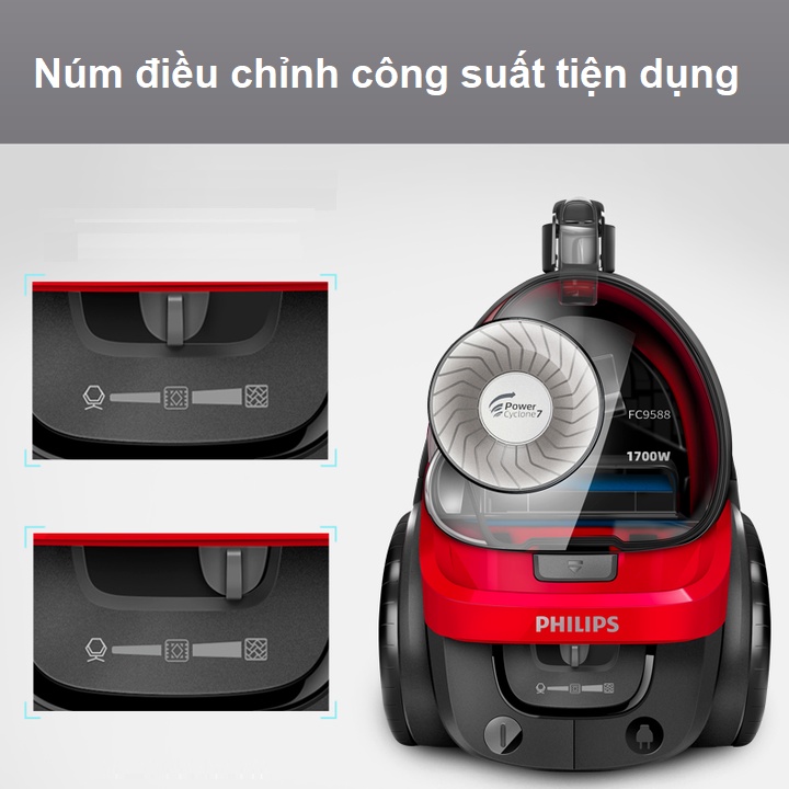 - Máy Hút Bụi Philips FC9588/81 với thân máy mang màu đỏ đen nổi bật, kiểu dáng nhỏ gọn sẽ giúp cho không gian căn bếp nhà bạn thêm sang trọng, hiện đại.