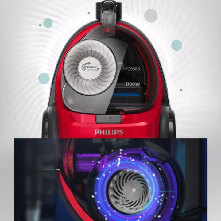 hilips 5000 series FC9588/81. Maximum input power: 1700 W. Type: Cylinder vacuum, Cleaning type: Dry, Dust container type: Bagless, Dust capacity: 1.5 L. Vacuum air filtering: HEPA, Dirt separating method: Filtering, Noise level: 82 dB. Product colour: Red