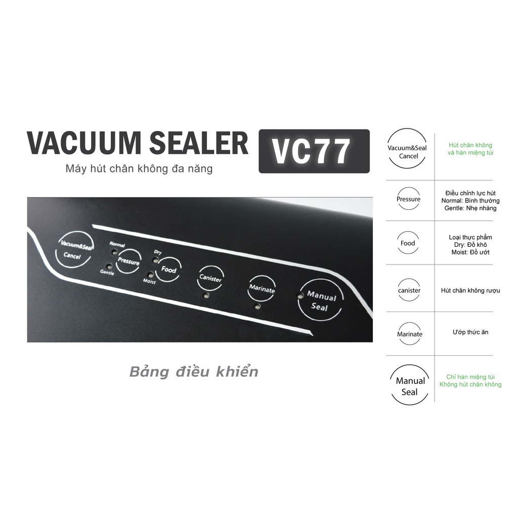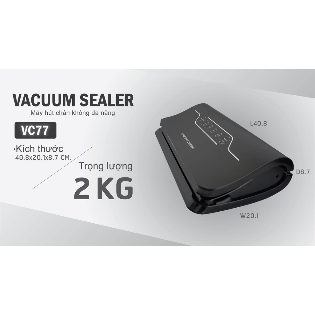 Máy hút chân không đa năng VC77 công nghệ đột phá với màn hình cảm ứng tích hợp dao cắt túi tiện dụng, giúp cho việc sử dụng dễ dàng hơn. Ngoài ra, máy còn có chức năng hút chân không bảo quản rượu vang, giúp ướp thịt cá nhanh, đường viền hàn tinh tế, có thể tái sử dụng hiệu quả cho những lần tiếp theo, tiết kiệm tối đa thời gian cho các bà nội trợ. Máy hút chân không VC77 còn có thể sử dụng kết hợp với phụ kiện riêng biệt như hộp hay bình hút chân không.