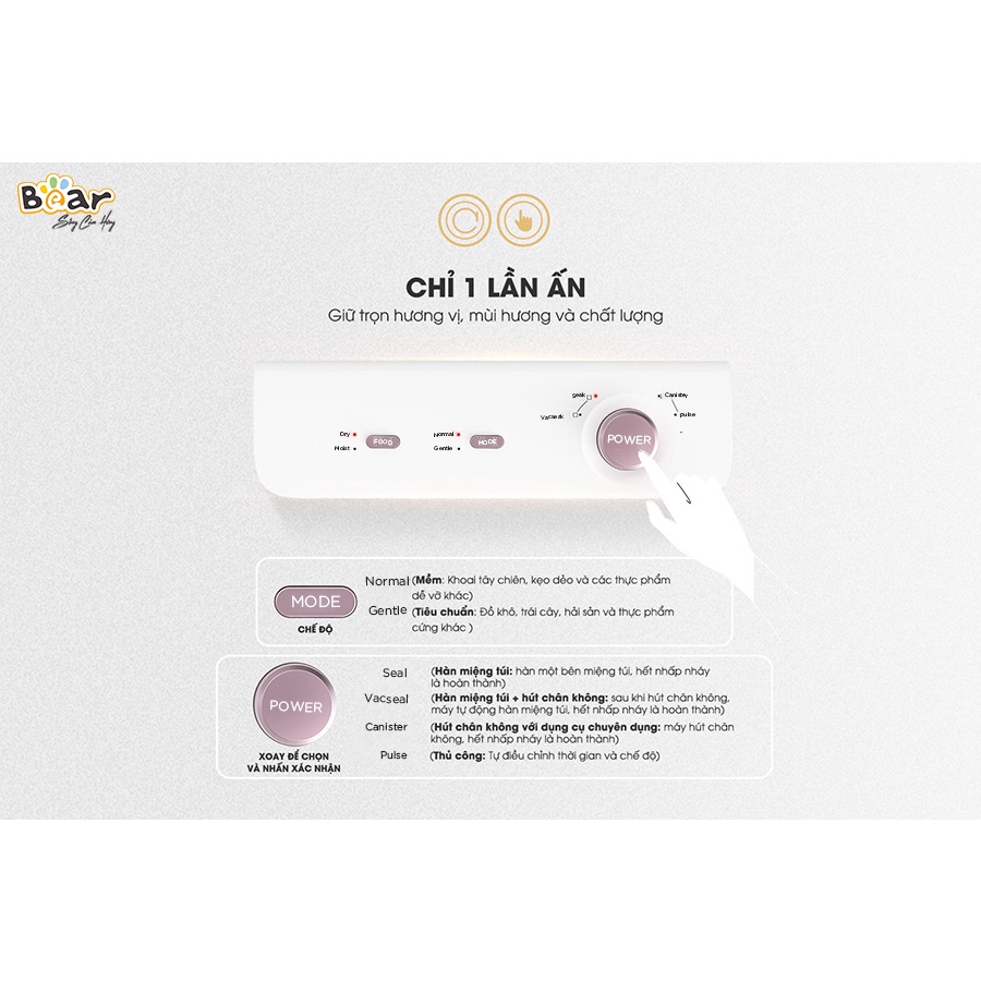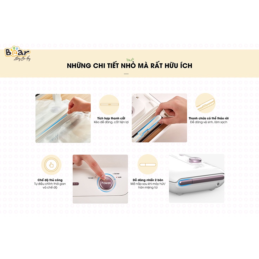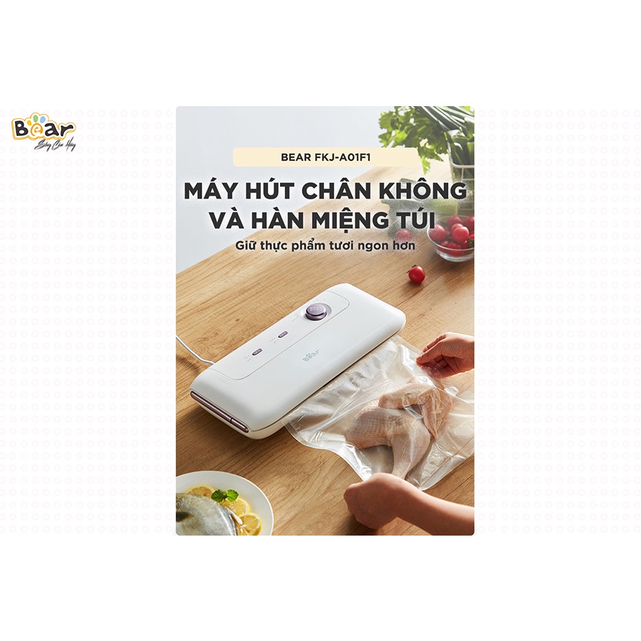 Máy Hút Chân Không Bear FKJ-A01F1 (VS-B01V1) phiên bản quốc tế được tích hợp 4 tính năng hút chân không, hàn miệng túi và hút chân không dạng hộp vô cùng tiện lợi giúp bạn đóng gói và bảo quản thực phẩm lâu hơn thông thường gấp 3 lần.