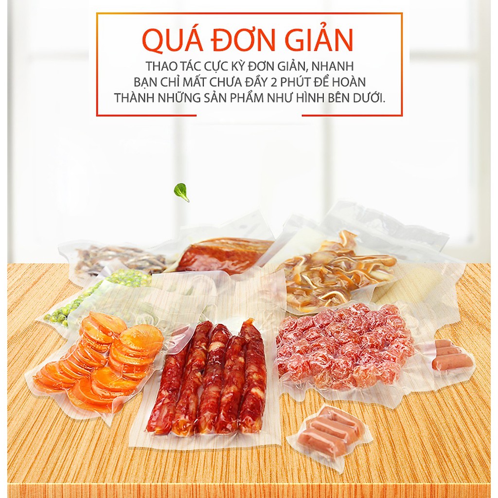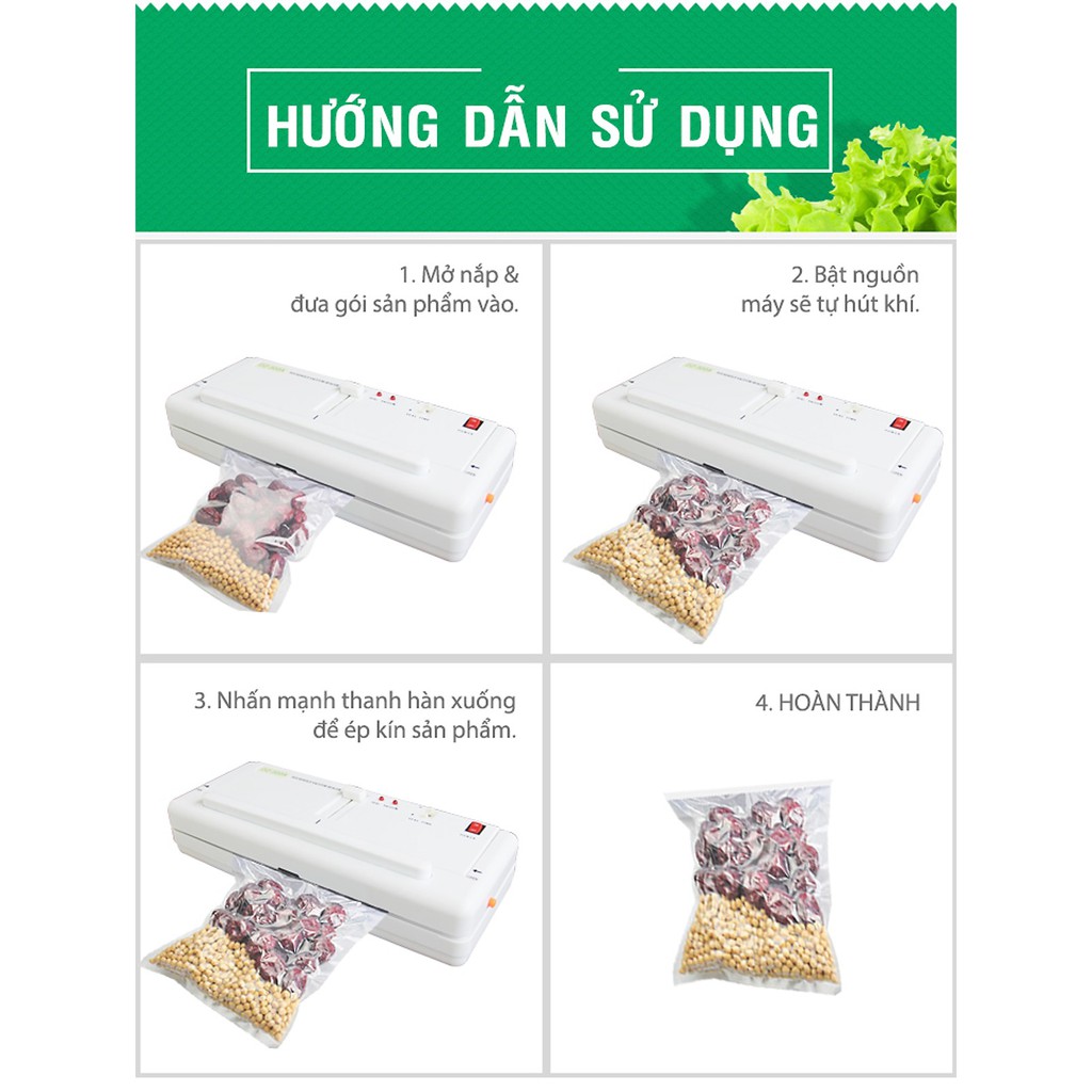 – Đi kèm với máy hút chân không là các túi ép nylon để đóng gói thực phẩm. Hầu hết các bao bì ép chân không này đều có thể tái sử dụng nhiều lần sau khi đã được rửa sạch, giúp tiết kiệm khi sử dụng.