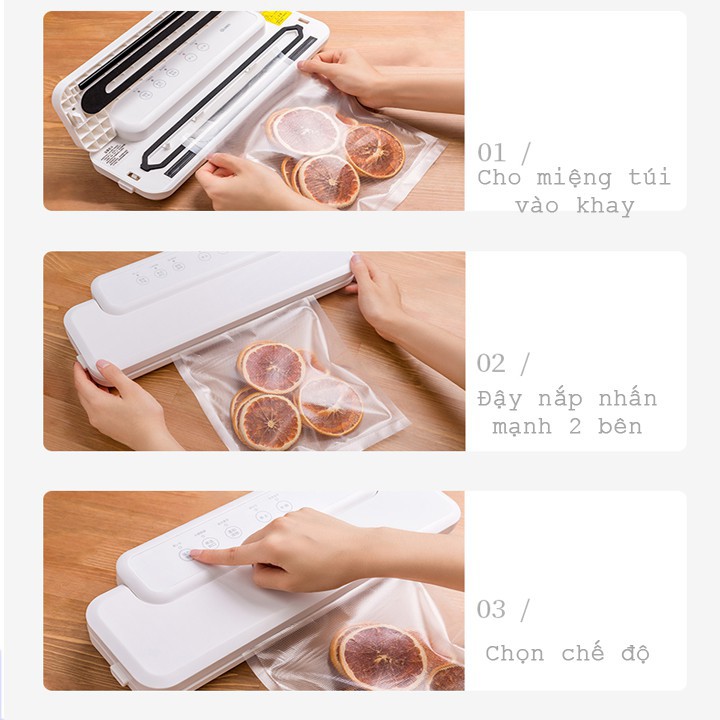 Nên xếp nguyên liệu trong túi sao cho gần sát với lưỡi hút nhất có thể để giúp máy hút chân không hiệu quả nhất. Nếu xếp nguyên liệu quá xa lưỡi hút sẽ làm cho túi bị mút vào lưỡi hút, kết quả là làm giảm khả năng hút của máy