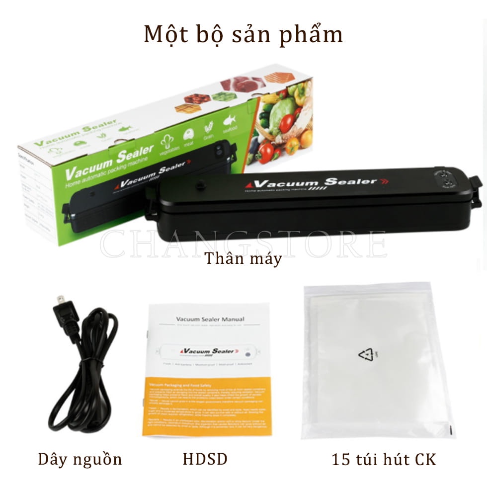 - 1 bộ sản phẩm bao gồm: 1 máy hút chân không + 1 sách hướng dẫn + 1 bộ 15 túi tặng kèm.