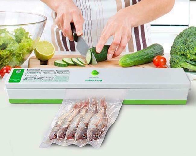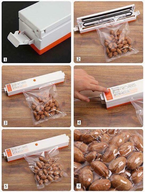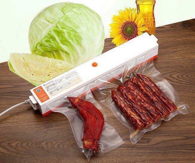 ☑️ Chỉ cần cho thực phẩm vào túi, kẹp miệng túi vào máy, và nhấn nút. Máy sẽ hút kiệt không khí bên trong, sau đó tự động hàn kín miệng túi. Thực phẩm được bảo quản trong môi trường yếm khí, ko bị oxy hóa, ko bị vi khuẩn tấn công, ngăn mùi, ngăn ẩm mốc, tươi ngon lâu hơn.