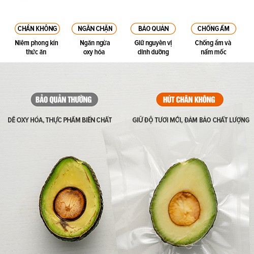 – Công dụng: Hút chân không + hàn túi nilon giúp bảo quản thực phẩm tốt hơn, lâu hơn và giữ được dinh dưỡng của thực phẩm.