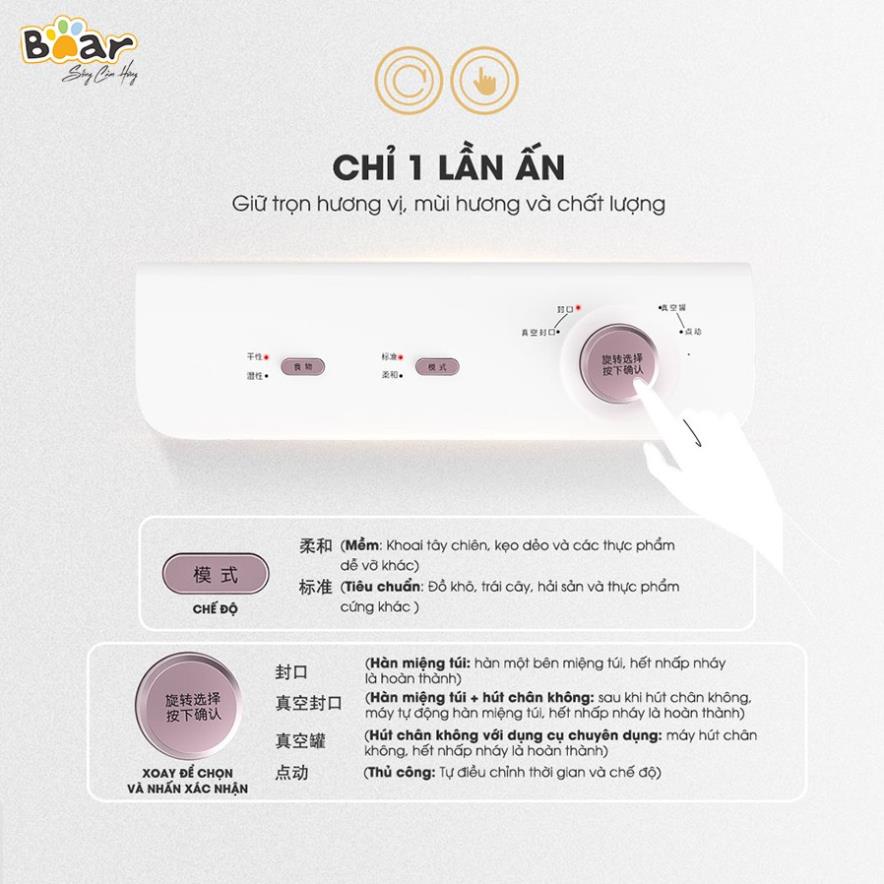 - Máy Hút Chân Không Bear FKJ-A01F1 với thiết kế nhỏ gọn, điều khiển cảm ứng thông minh tích hợp công nghệ hút chân không nhanh chóng chỉ trong vòng 30 giây.