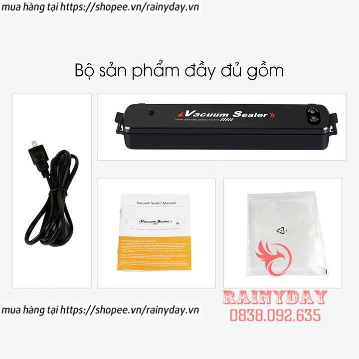 - 1 bộ sản phẩm bao gồm: 1 máy hút chân không + 1 sách hướng dẫn + 1 bộ 10 túi tặng kèm.