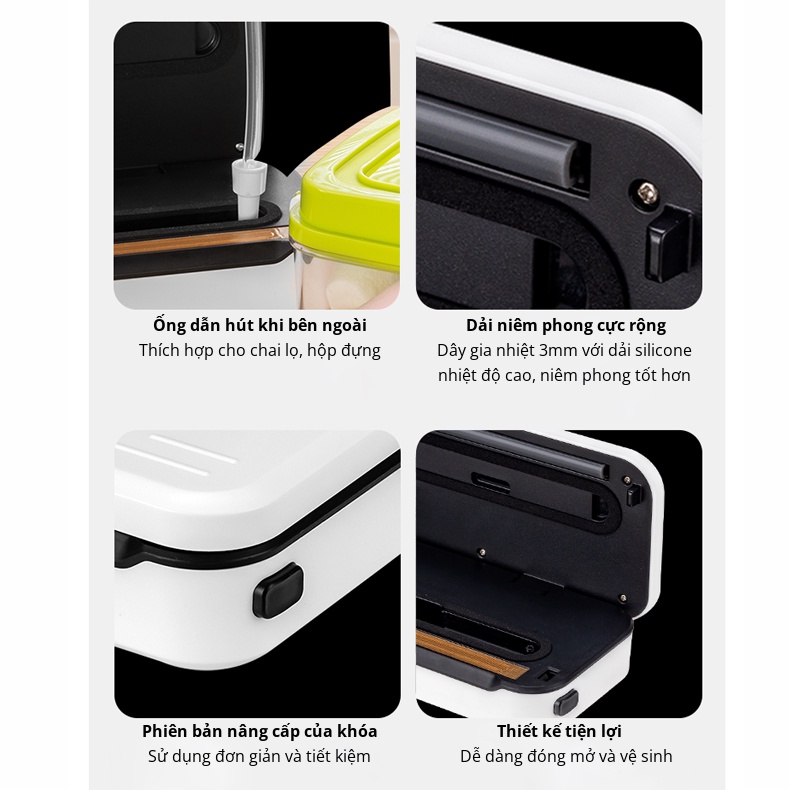 Không chỉ hút chân không túi đựng thực phẩm thông thường, bạn có thể sử dụng ống phụ kiện đi kèm theo để niêm phong và bảo quản thực phẩm đựng trong chai lọ, hộp đựng hoặc túi chuyên dụng có ống bịt miệng.