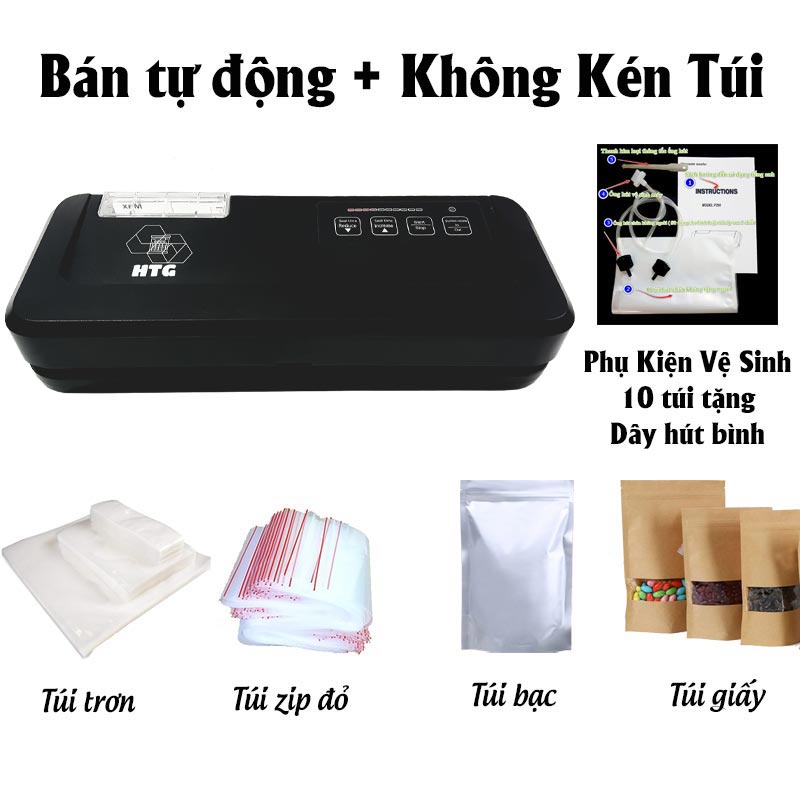 - Bộ sản phẩm bao gồm: 1 máy hút , 1 mũi tên kim loại để thông tắc vòi hút , ống hút chân không ngoài cho bình hút, 1 sách HDSD tiếng việt HTG, 1 phiếu bảo hành HTG, 10 túi tặng kèm 20x25cm